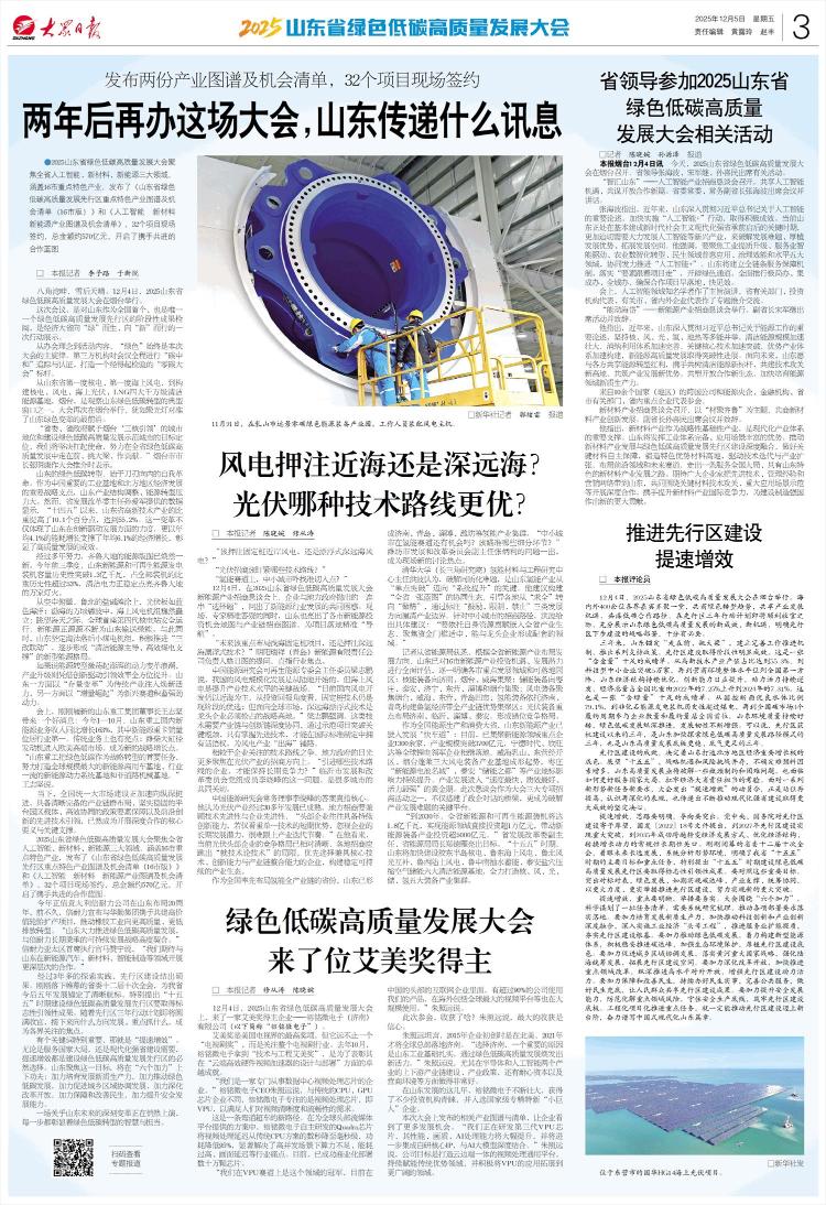 □ 新华社记者郭学雷报道,11月21日,在乳山市远景零碳绿色能源装备产业园,工作人员正在组装风力发电机主电机。扫描二维码查看专题报道 ●2025年山东省绿色低碳高质量发展大会聚焦全省人工智能、新材料、新能源三大领域,覆盖16市主要特色产业。公司发布了《山东省优质低碳绿色发展先行区主要特色产业地图及机会清单(16市版)》和《人工智能、新材料、新能源产业地图及机会清单》。当地签约项目32个,总金额约570亿元,共同推进计划开启。 □ 李子路宇 新月记者 八角湾岸边,雪后天空晴朗。跌落。 12月4日,2025年山东省绿色低碳高质量发展大会在烟台召开。会议将回顾山东省作为全国第一个也是唯一一个绿色低碳高质量发展先行区取得的阶段性成果。这是一个主要经济国家走向“绿色”、“新”的行为体现。从会议理念到活动内容,“绿色”始终是本次会议的主旋律。第三方将在整个会议过程中进行“碳中和”监测和认证,为通过测试的“零碳会议”树立标杆。从第一代核电和山东海上风电到建设核电、风电、海上太阳能、液化天然气等4000万个清洁能源基地,烟台是观察山东绿色低碳转型的典型窗口之一。。大会再次在烟台召开,凸显了山东绿色转型的前沿。 “省委、省政府赋予烟台‘三核主导’城市地位和建设高质量低碳绿色发展示范城市的目标,我们将坚决肩负起这一使命,发挥引领作用,努力为全省高质量低碳绿色发展作出贡献。”烟台市市长张明康在推介大会时表示。山东的绿色低碳转型始于内部的自我革命。山东省作为我国重要的工业基地和北方地区经济发展的重要战略支撑点,正在经历产业结构调整和能源转型,我的压力很大。不过,根据省发改委主任孙爱军提供的数据,“十四五”以来,山东省高新技术产业比重提高10.1个百分点,达到55.2%。这一变化不仅体现了山东创新驱动发展的实力,也支撑了年均6.1%的经济增长和年均4.1%的能源消费增长,彰显了高质量发展的成效。经过多年努力,齐鲁能源版图焕然一新。 今年前三季度,山东省新能源和可再生能源装机历史性突破1.3亿千瓦,占总装机容量的53%以上。清洁电力源源不断地照亮齐鲁千家万户。从空中俯瞰,位于鲁北盐碱沼泽地的太阳能电池板就像一片蓝色的海洋。海上风力涡轮机傲然屹立渤海碧波浩瀚。放眼海天,全球首座第四代核电站安全运行,新电源持续为山东供应绿色能源。与此同时,山东省逐步淘汰落后小燃煤电厂,通过“三项改革协同”,逐步形成“以清洁能源为主导、高效煤电为支撑”的新能源格局。如果说能源革命引发了能源变革浪潮,那么工业进步则通过更大的创新带来了整体效率的提高。山东省一方面通过“股改”为传统产业注入新活力,另一方面通过“升级”在新兴线路上积蓄强劲动能。会上,新任山东重工集团总裁王志坚带来了好消息。今年1月至10月其中,山东重工国内新能源业务收入同比增长163%,新能源重卡销量位居行业第一。对于传统企业来说也有积极的一面。这是一个大型的潍柴坦克。直径发动机已进入欧美高端市场,成为新的战略增长点。 “山东重工把绿色低碳排放作为战略转型的主要挑战,打造了全球最大的商用新能源汽车基地、行业领先的新能源动力系统基地、非道路车辆机械基地。”王志坚说。当前,全国统一市场建设正在加快推进。集团清晰完整的产业链布局、扎实稳定的园区平台、高效协同的政策要素、前沿的创新和先进的技术领先优势,为集团的发展奠定了坚实的基础。成为密切合作的核心本质和重要支撑。全省绿色低碳高碳发展山东质量2025会议聚焦全省人工智能、新材料、新能源三大领域,覆盖16个主要特色产业的《山东高质量低碳绿色发展先行区主要特色产业地图及机遇清单(16市版)》和《人工智能、新材料、新能源产业地图及机遇清单》发布。倍耐力宣布将与华勤集团合作建设高价值轮胎扩建项目,加速橡胶行业向更高质量、更低排放的转型。 “山东大力推动高质量、低碳、绿色发展,与倍耐力长期可持续发展战略非常契合。”我们期待与山东深化合作倍耐力亚太区首席执行官马赞宁表示:“经过三年多的探索实践,试验区建设取得了丰硕成果。”刚刚结束的省委十二届十次全会,为我省未来五年的发展指明了明确的航标,特别提出建设高质量低碳绿色发展试验区“十五五”时期先行先试成果 随着先行区三年行动计划进入收尾阶段,大家都在关注先行区的发展方向和重点,其中尤为重要的关键词就是“加快增效”,这是建设绿色低碳高质量发展先行区的必然选择,山东省将全力以赴落实这一目标。不是“六强”。具体来说,加强培育发展新生产力,加强推动绿色低碳发展,加强推动城乡合作发展,加强深化改革开放,加强保障和改善民生,强化保障。开发能力。山东的未来正在悄然发生重大变化,每一步都彰显着绿色低碳转型的智慧和责任。